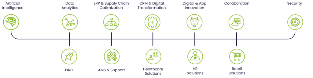 Business Application (ERP, XRM), Data & Analytics (AI/ML), IoT, M365 Security