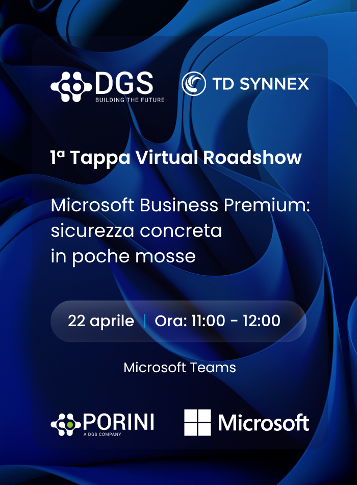Benvenuti alla prima tappa del Virtual Roadshow organizzato da Porini – Centro di Eccellenza Microsoft di DGS in collaborazione con TD SYNNEX, un percorso digitale dedicato a Microsoft Security, Microsoft Copilot e Microsoft Fabric.