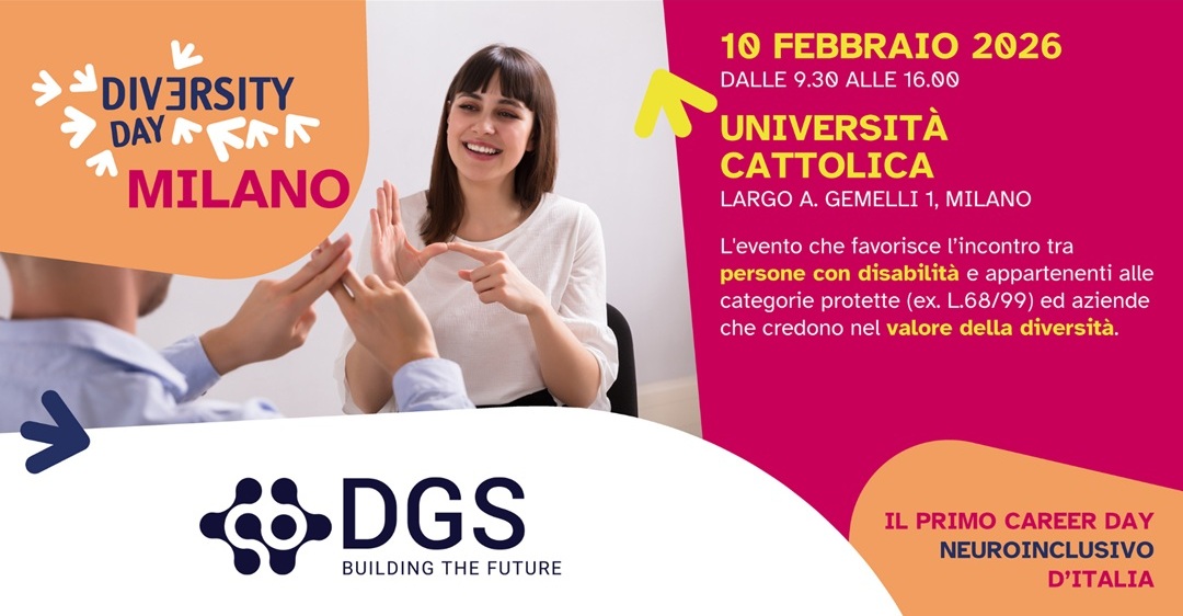 Il 10 febbraio 2026 DGS parteciperà al Diversity Day Milano, il principale evento italiano dedicato all’inclusione lavorativa di persone con disabilità e appartenenti alle categorie protette (ex L.68/99).